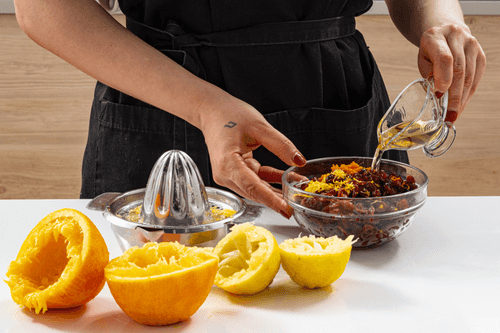 Wash the cranberries with hot water. Peel the lemon and orange and squeeze the juice. Mix the cranberries with the juice and zest.