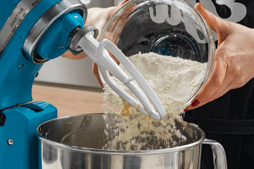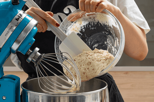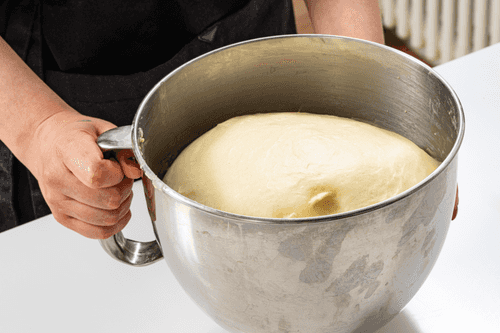 When the dough pulls away from the sides of the bowl, gradually mix in 70 g of softened butter.