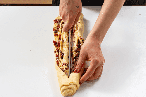 Roll the layers into rolls, then cut each one in half lengthwise, leaving one end uncut.
