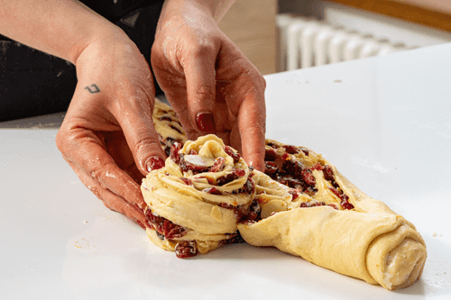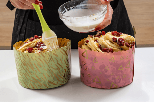 Roll the cut rolls into spirals and place them in the kulich molds. The dough should barely reach the edges of the molds. Let the kulich rise for 40-60 minutes before baking.