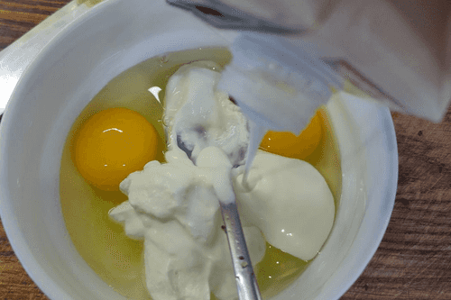 Break the eggs into a bowl, add sour cream and cream.
