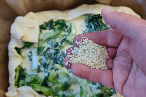 Sprinkle sesame on top of the pie.