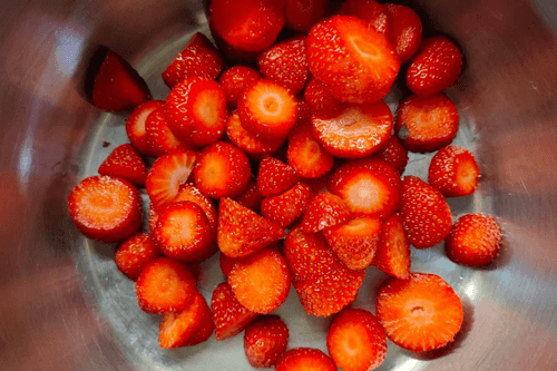 Cut the strawberries into small pieces and place them in a pot.