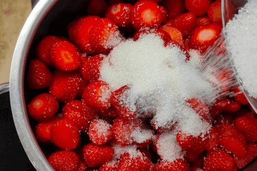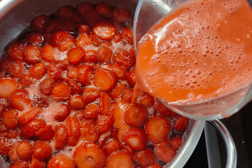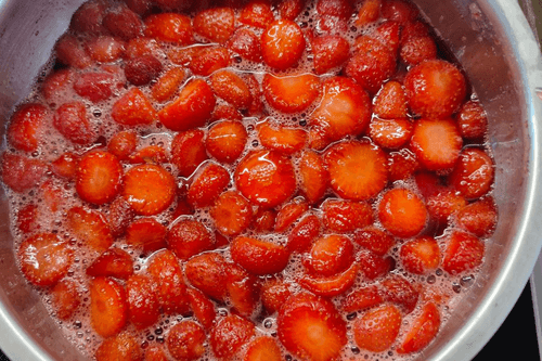 Simmer strawberries with sugar on low heat until partially cooked.