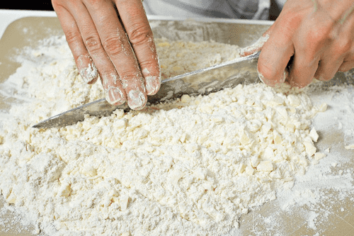 Sprinkle 140 grams of flour on a dry working surface. Add 30 grams of very cold butter, cut into cubes, and chop finely. Add salt and another 60 grams of butter. Chop it less finely, leaving pea-sized pieces. Transfer the flour and butter to a bowl.