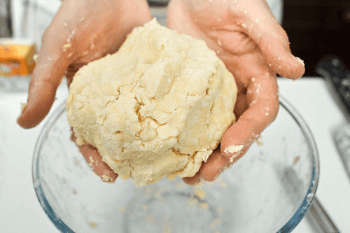 Pour 100 ml of ice water into the dough with a spoon, kneading it as if gathering something loose in your hands. A ball will form — it shouldn't be smooth and pretty, the main thing is that it doesn't fall apart. Wrap it in film and put it in the fridge for at least an hour — it's important for the butter in the dough to freeze. In the meantime, you can peel the apples and cut them into not too thin slices.