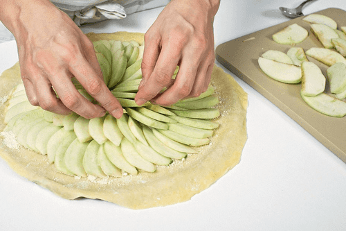 Roll out the dough to a thickness of 4 mm and cut a circle 3 cm larger in diameter than the baking form. Transfer it to a flat form lined with parchment. Mix a tablespoon of flour with half the sugar and almonds, sprinkle over the galette, and arrange the apples on top in concentric circles, overlapping.