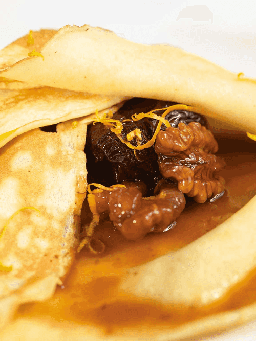 Wheat pancakes with prune, walnut and orange juice sauce