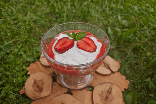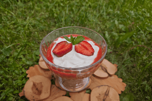 Decorate the finished dessert with strawberries and a sprig of mint.