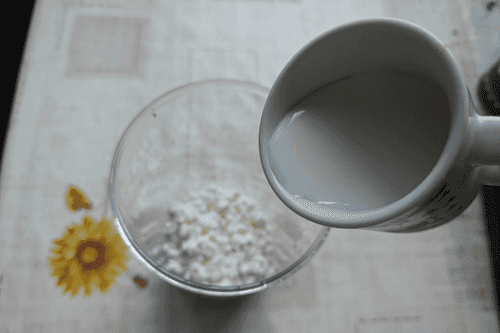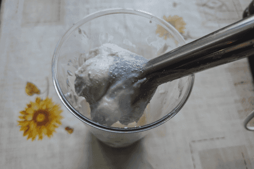 Transfer the cottage cheese mass to the blender bowl and pour in the milk.
