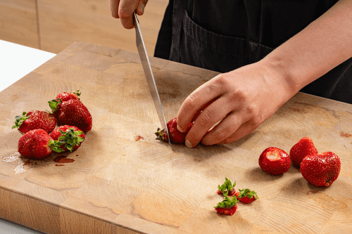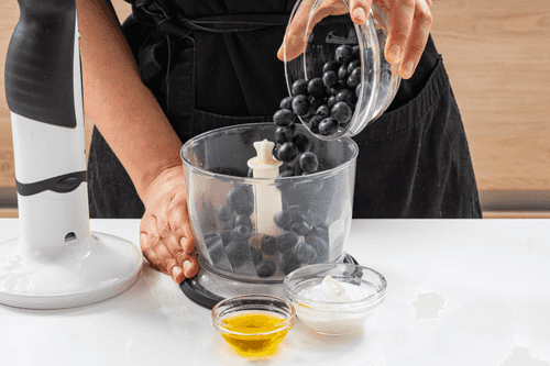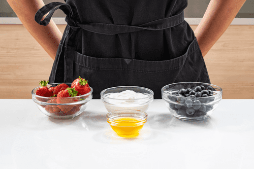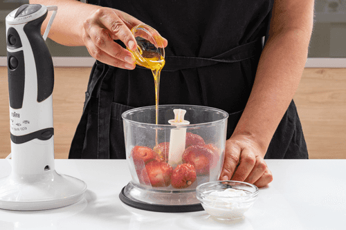Blend strawberries, 40 grams of yogurt, and 20 grams of honey. You can add more honey if desired.