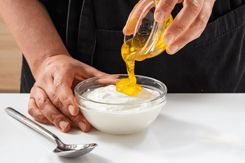 Mix 180 grams of yogurt and 40 grams of honey in a bowl; you can make it sweeter if desired.