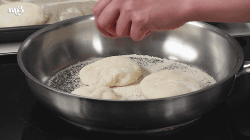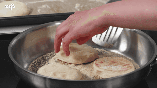 Heat a large skillet over low heat. Dust with semolina and place several muffins. Cover with a lid and fry for 5 minutes.