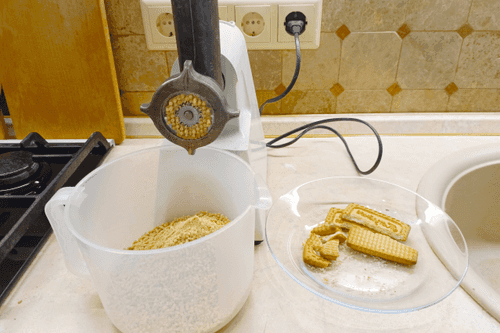 Crush the cookies and crackers through a meat grinder or blend them into fine crumbs. For the pie base, you will need 1 and 3/4 cups. Transfer the crumbs to a deep bowl.