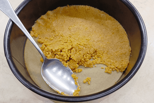 Preheat the oven to 180 degrees on the 'top/bottom' mode. Place half of the dough in the bottom of the mold, spread it out, compact it, and smooth it with a tablespoon.