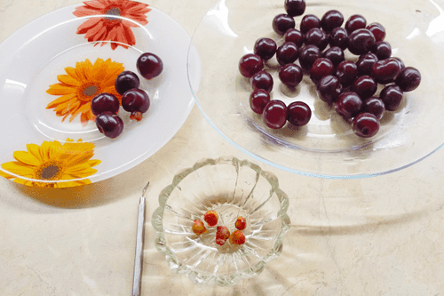 Wash and dry the berries, remove the pits from the cherries, and cut off the stems from the strawberries.
