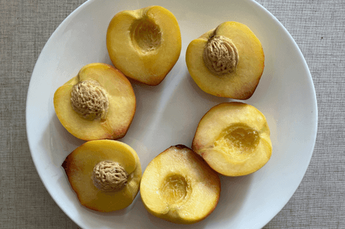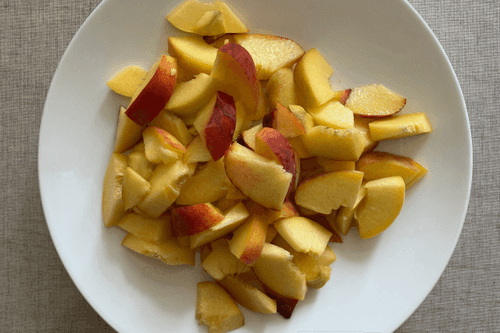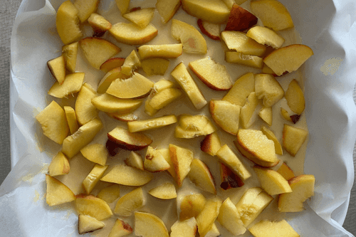 Line the baking pan with parchment and add some dough. Place peaches on top.