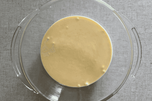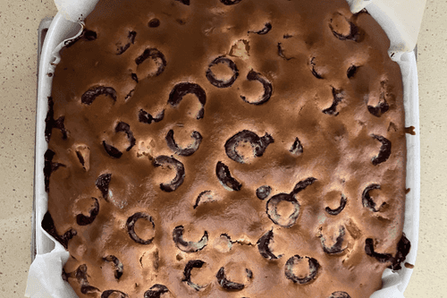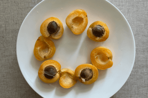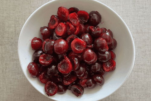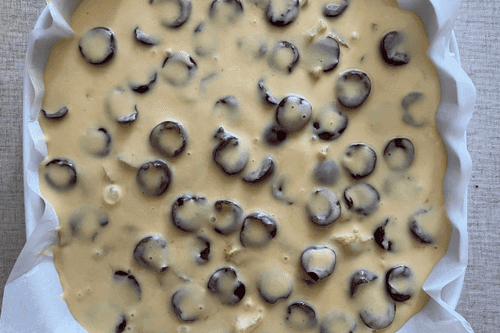 Put some dough on the apricots and place cherries on top. Cover with the remaining dough.
