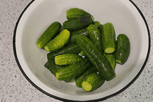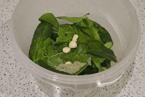 Place about half of the cucumbers in the bucket. On top of the cucumbers, add some horseradish leaves, dill flowers, garlic, allspice, cherry leaves, and bay leaves.