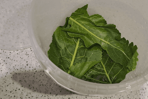 Wash a 3-liter bucket well with soda. Place horseradish leaves at the bottom of the bucket.