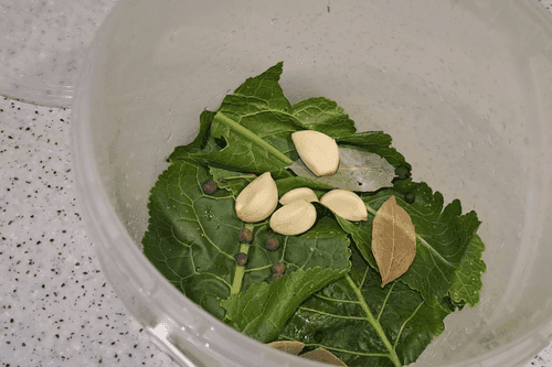 Place half of the peeled and washed garlic and 3 bay leaves in a bucket on the horseradish leaves.