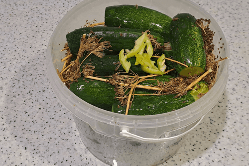 Fill the bucket to the top with the remaining cucumbers, hot pepper, and dill flowers.