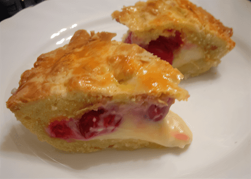 On the prepared base, we spread the cooled custard and cherries. We sprinkle the cherries with powdered sugar.