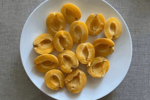 Wash the apricots, dry them, cut them in half, and remove the pits.