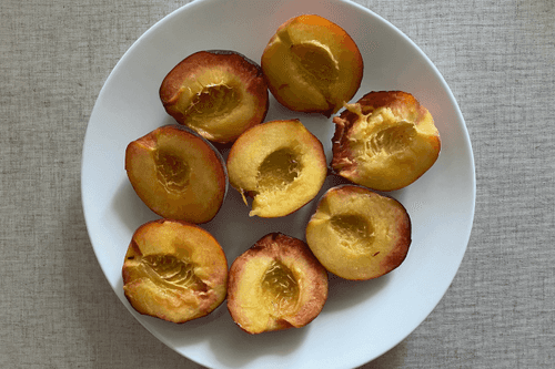 Wash the peaches, dry them, cut them in half, and remove the pits.