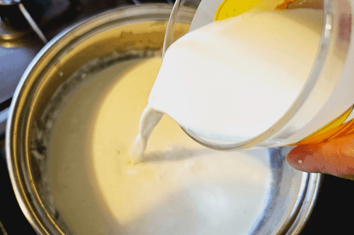 Pour the milk into the cream.
