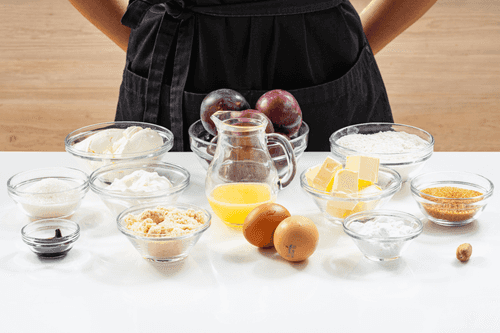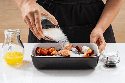 Remove the pits from the plums and chop them coarsely. Transfer them to a baking dish, add 1 teaspoon of vanilla paste, sugar, orange juice, and a pinch of salt.