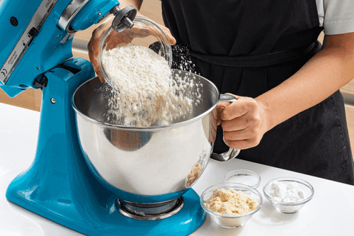 Prepare the pie base. Mix both types of flour, powdered sugar, and 1 gram of salt in a blender bowl.