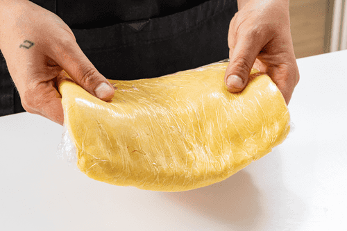 Take the dough out of the bowl and shape it into a flat piece. Wrap it in plastic wrap and refrigerate for 30 minutes.