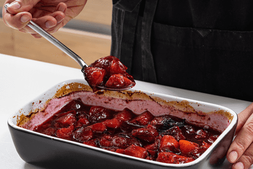 Bake for 40 minutes, stirring every 10-15 minutes, until the plums are soft and the juice thickens to a light syrup consistency.