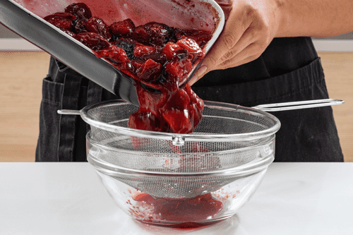 Blend the plums with the remaining juice. Strain the puree to remove the skin.