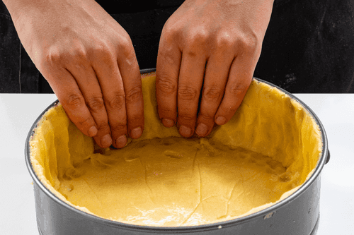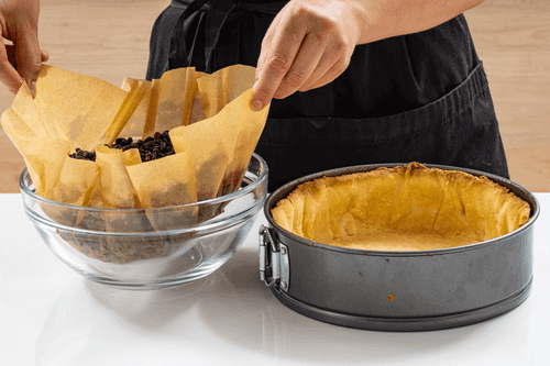 Line the dough with parchment and fill it with baking beans (or dry beans), pressing the edges firmly. Bake the crust for 20 minutes.