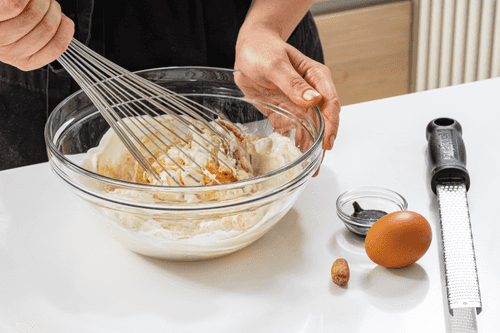 In a bowl, mix mascarpone cheese, sour cream, and brown sugar until smooth. Then add the egg, remaining vanilla paste, and ground nutmeg.