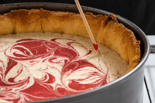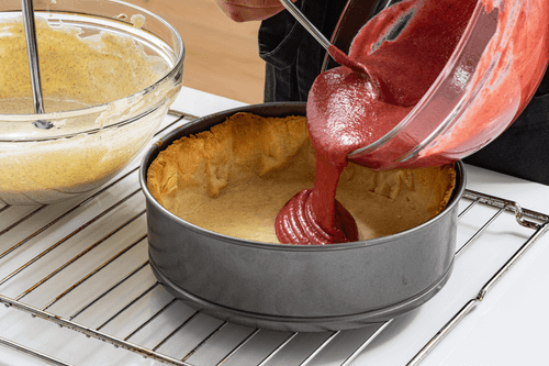 Spread a few spoonfuls of plum puree on the pie crust to cover the bottom. Then pour in the cheese filling.