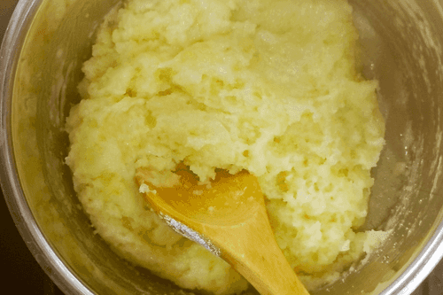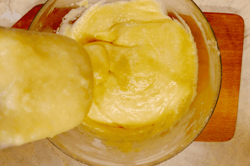 Remove from heat, stir, cool to a warm state, and add eggs one by one, mixing thoroughly.