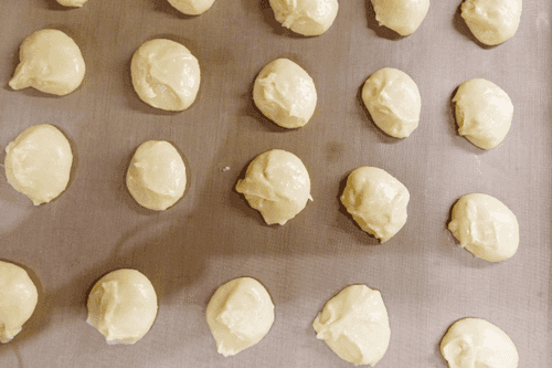 Using a piping bag or a teaspoon, place the dough on a baking sheet lined with a silicone mat or parchment paper. Put the baking sheet in an oven preheated to 185 degrees. After 15 minutes, when the profiteroles rise and brown, reduce the temperature to 160 degrees. Do not open the oven. Bake for another 25 minutes.