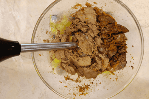Transfer the ingredients to a bowl, blend everything with an immersion blender until creamy, add 50 grams of butter, and blend again.