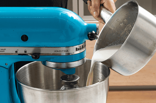Slowly pour the hot cream with milk into the yolk mixture, whisking constantly.