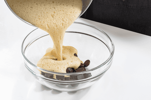 Separate the eggs into whites and yolks. Whisk the yolks with brown sugar, coffee, boiling water, salt, and a teaspoon of vanilla paste. Set the whites aside.