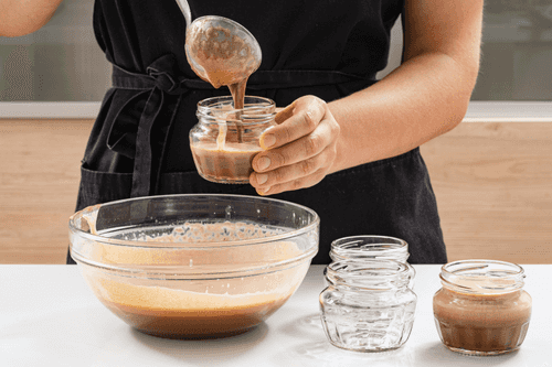 Pour the chocolate cream into the warmed jars, leaving a couple of centimeters from the edge, and close them with lids.