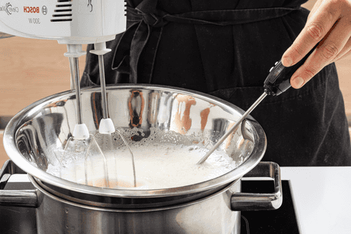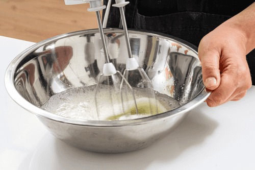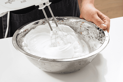 Remove the bowl from the bath and whip the egg whites with a mixer into a fluffy meringue.