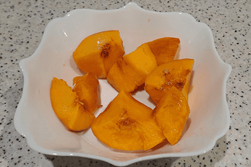 Wash the peach well under running water, remove the pit, and cut into large cubes.