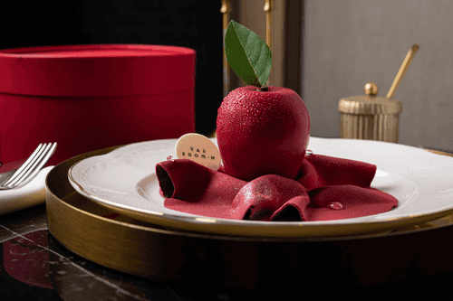 Before serving, add a chocolate twig, a leaf (from an apple tree or, for example, lime) to the apple and spray with water from a spray bottle.
