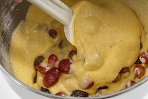 Gently fold half of the grapes into the dough.