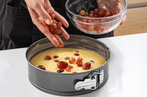 Place the dough in the mold and distribute the remaining grapes on top.
