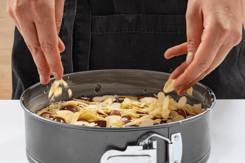 Sprinkle with almond flakes and place in the oven for 40 minutes. Check readiness with a toothpick: insert it into the center of the pie, if it comes out dry, the pie is ready.